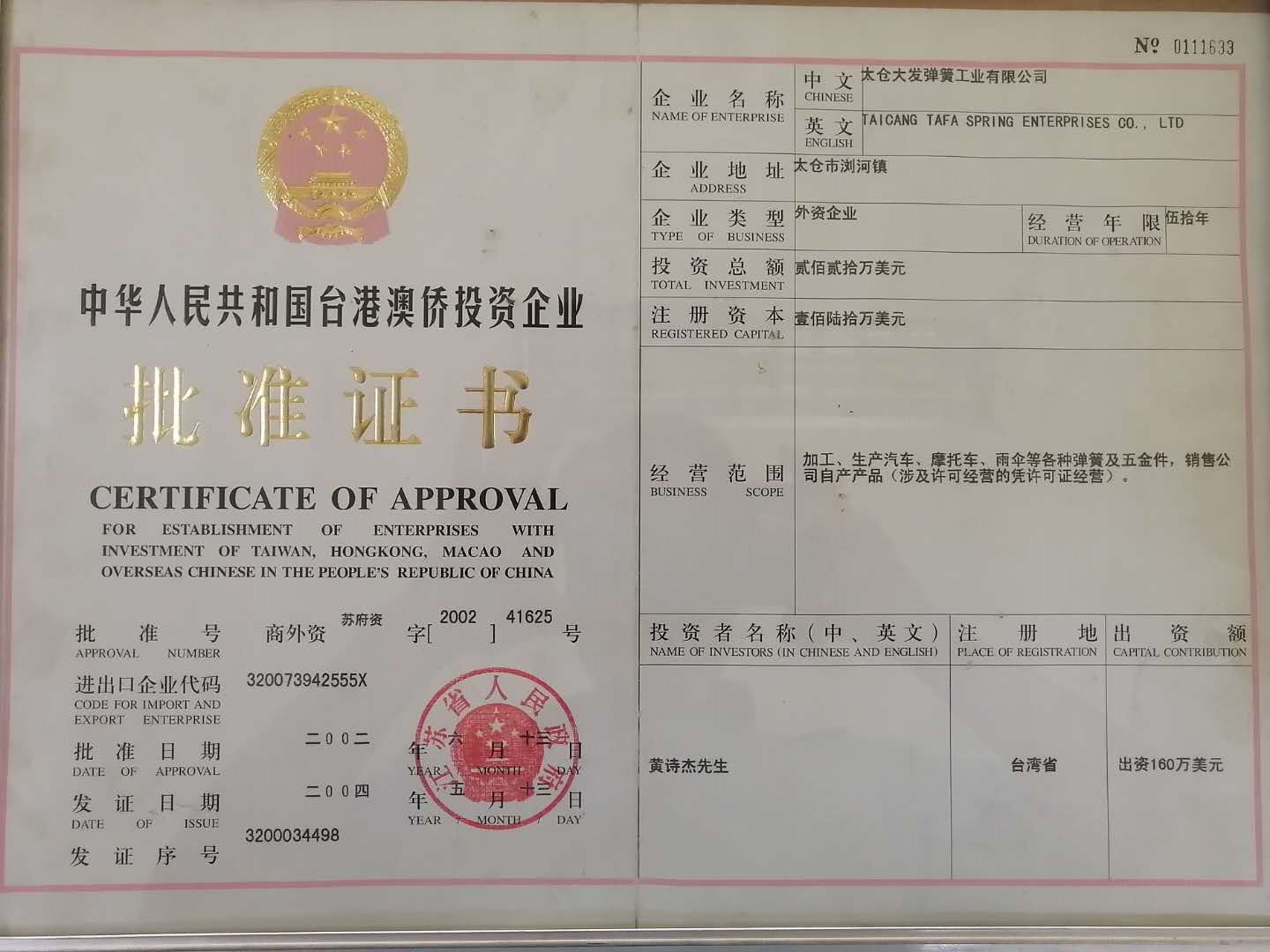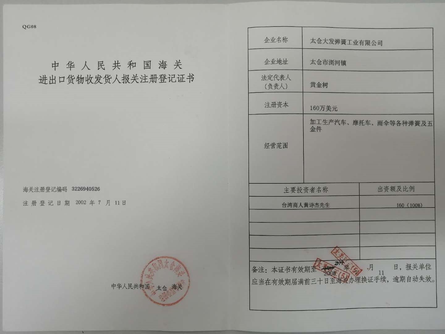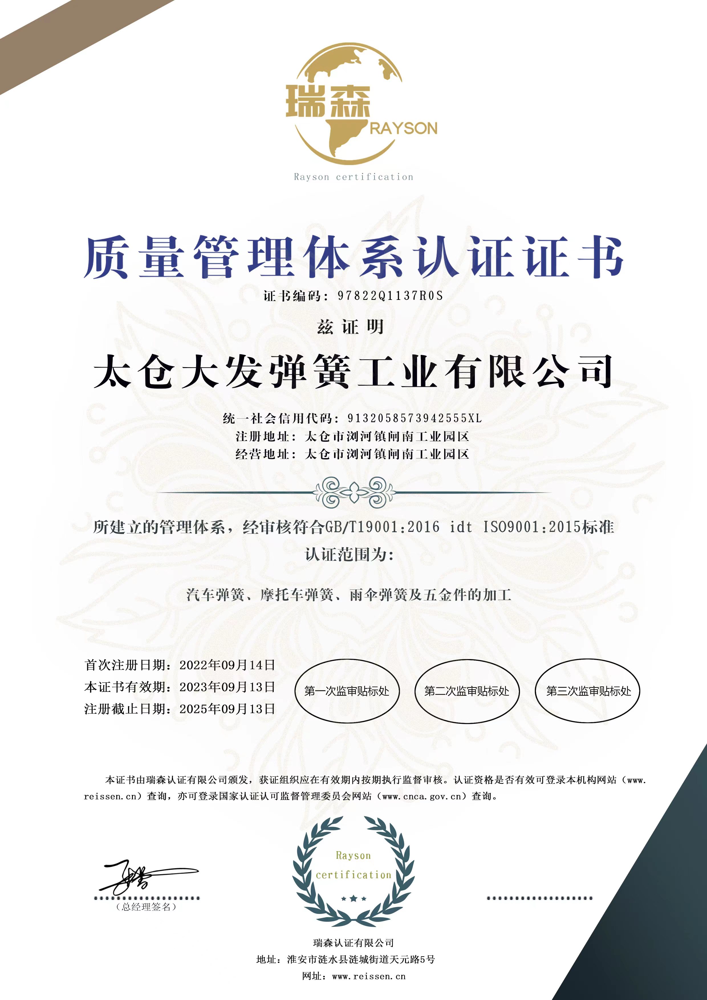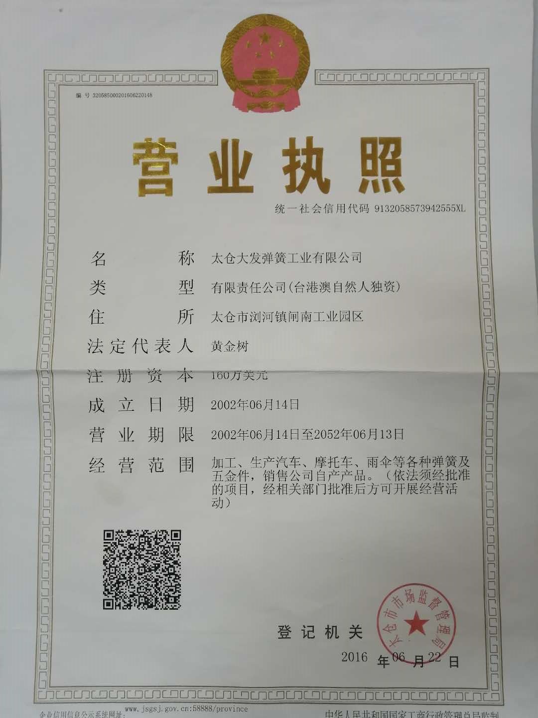 太倉大發(fā)彈簧工業(yè)有限公司由黃金樹先生于1967年始創(chuàng)于臺灣,是一個集雨傘、電子、五金機(jī)械、自行車、摩托車、汽車等的彈簧配件生產(chǎn)、加工、輔助設(shè)計服務(wù)的綜合性企業(yè),其中1990年創(chuàng)辦的廈門大發(fā)彈簧公司、2000年創(chuàng)辦的深圳大發(fā)彈簧公司、2002年創(chuàng)辦的太倉大發(fā)彈簧公司均位于經(jīng)濟(jì)發(fā)展地區(qū),地理位置佳。我們憑借在彈簧制造業(yè)的多年豐富知識與技術(shù),并著眼于以客戶為導(dǎo)向,秉持“以人為本,以質(zhì)為先,以客為主,持續(xù)創(chuàng)新”的經(jīng)營理念,強(qiáng)化競爭優(yōu)勢。公司導(dǎo)入ISO9001: 2000質(zhì)量管理體系,執(zhí)行ISO14000:2000管理方式,倡導(dǎo)安全、高質(zhì)量、高素質(zhì)的生產(chǎn)。